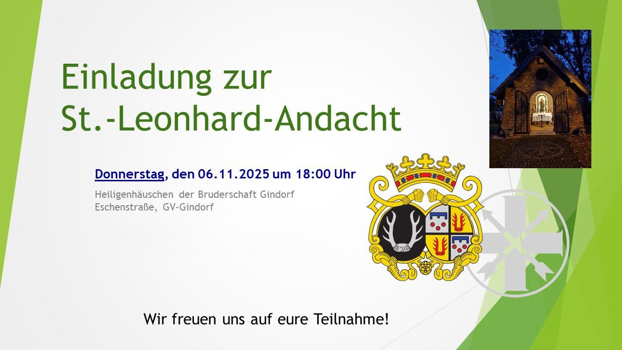 „An diesem Sonntag feiert die katholische Kirche den Namenstag des heiligen Leonhard“, so Ehrenbrudermeister Robert Hoppe. „In unserem Heiligenhäuschen an der Eschenstraße in Gindorf wird seit vielen Jahrzehnten eine Figur des heiligen Leonhard aus dem ehemaligen Heiligenhäuschen bei dem Gut St. Leonhard bis zum heutigen Tag verehrt.“ Diese Heiligenfigur wurde vor einigen Jahren auf Initiative des Gindorfer Jägerzuges "Treu zur Heimat" ebenso restauriert wie eine Massiv-Holzfigur des heiligen Sebastianus aus dem 15. Jahrhundert und eine Muttergottesfigur aus dem 18. Jahrhundert. „Nach entsprechenden Veranstaltungen seit dem Jahr 2011", ergänzt Brudermeister Jürgen Moll, „musste dieses Zusammenkommen bislang nur in 2020 wegen Corona ausfallen. Doch nach einem erfolgreichen Restart möchten wir auch in diesem Jahr gemeinsam mit Diakon Dr. Hans Willi Winden, mit unseren Mitgliedern und mit den Bewohnerinnen und Bewohnern unseres Ortes an diesem Abend an unserem Heiligenhäuschen wieder eine kurze Andacht feiern, um damit das karitative Wirken des heiligen Leonhard in besonderer Weise ehren."